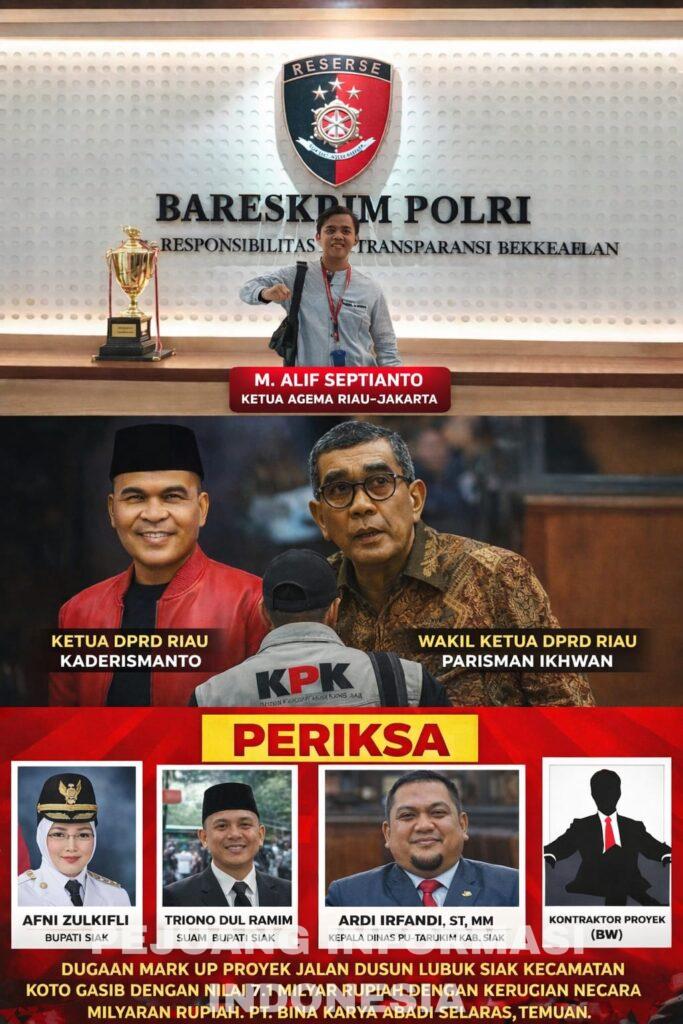 ” Ketua Mahasiswa (AGEMAR-JA) M. ALIF SEPTIANTO dan Rekan-Rekannya, Terus mendorong Persoalan ini Ke KPK RI, Kejagung RI, dan Mabes Polri DiJakarta,. “Atas Dugaan Tindak Pidana Korupsi dan Monopoli Proyek di Kabupaten siak”, Serta Dugaan Jual Beli Proyek Oleh Pimpinan DPRD Provinsi Riau. “Pasalnya yang terjadi di Kab. Siak menimbulkan sebuah Kecurigaan, sebab Lelang Kegiatan…