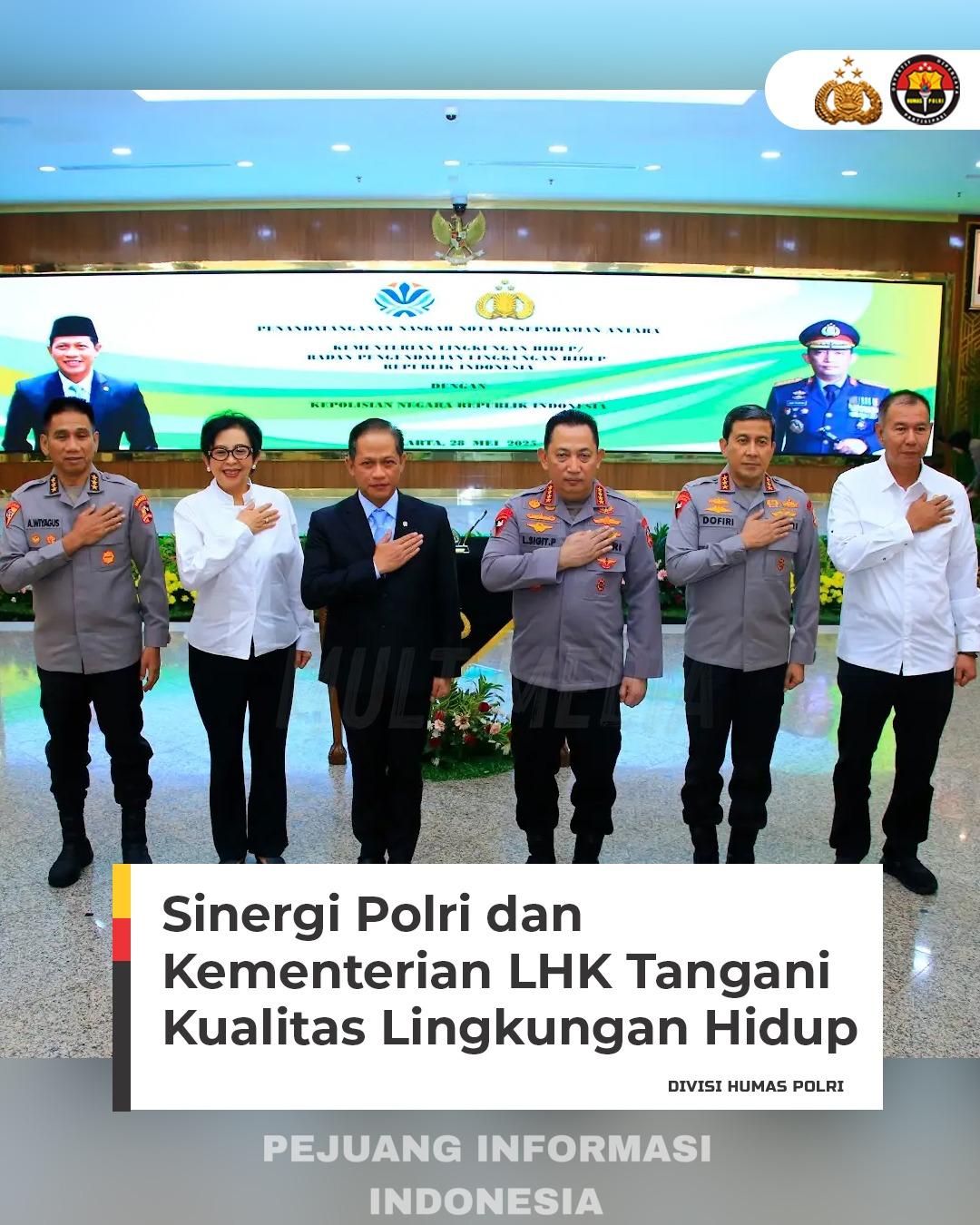 Jakarta, 28 Mei 2025 — Kepolisian Republik Indonesia (Polri) dan Kementerian Lingkungan Hidup dan Kehutanan (LHK) resmi menandatangani nota kesepahaman (MoU) dalam rangka meningkatkan kualitas lingkungan hidup di Indonesia. Penandatanganan dilakukan oleh Kapolri Jenderal Polisi Drs. Listyo Sigit Prabowo, M.Si. dan Menteri LHK Hanif Faisol Nurofiq di Mabes Polri, Jakarta Selatan, pada Rabu (28/5).