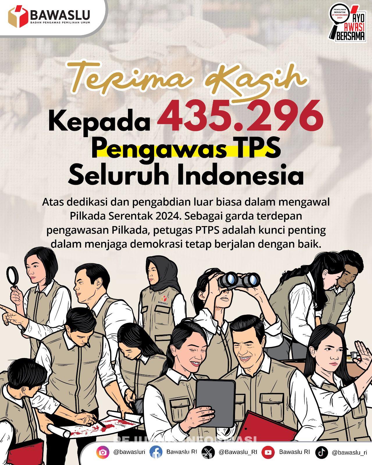 Ketua Bawaslu, Rahmat Bagja, menyampaikan apresiasinya kepada para pengawas TPS atas kerja keras dan komitmen mereka. “Kami mengucapkan terima kasih yang sebesar-besarnya kepada seluruh pengawas TPS di Indonesia. Peran Anda sangat penting dalam menjaga integritas demokrasi di negeri ini. Semoga jejak pengabdian Anda menjadi kontribusi nyata untuk kemajuan demokrasi di Indonesia,” ujar Bagja.