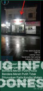 Berawal temuan dugaan perlintasan kru media ini, tuk adanya Lamsineg NKRI (lambang dan simbol negara dari Negara Kesatuan Republik Indonesia) yang berbentuk Bendera Merah Putih diabaikan dalam SOP(standar operasional prosedur) pelaksanaannya dan tidak adanya revitalisasi kantor oleh Oknum UPTD Puskemas(unit pelaksana teknis daerah pusat kesehatan masyarakat) Aek Ledong, Senin 17/11/2025, pukul 23.02.58 wib yang terletak di Jalan Lintas Nasional Desa Ledong Barat Kecamatan Aek Ledong Kabupaten Asahan Provinsi Sumut(Sumatera Utara).