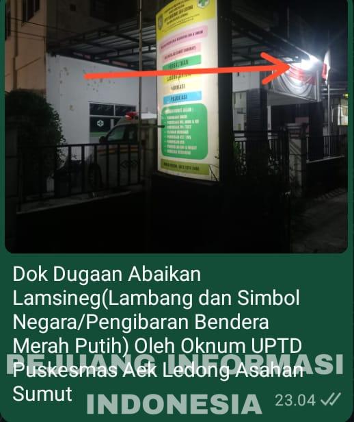 Berawal temuan dugaan perlintasan kru media ini, tuk adanya Lamsineg NKRI (lambang dan simbol negara dari Negara Kesatuan Republik Indonesia) yang berbentuk Bendera Merah Putih diabaikan dalam SOP(standar operasional prosedur) pelaksanaannya dan tidak adanya revitalisasi kantor oleh Oknum UPTD Puskemas(unit pelaksana teknis daerah pusat kesehatan masyarakat) Aek Ledong, Senin 17/11/2025, pukul 23.02.58 wib yang terletak di Jalan Lintas Nasional Desa Ledong Barat Kecamatan Aek Ledong Kabupaten Asahan Provinsi Sumut(Sumatera Utara).