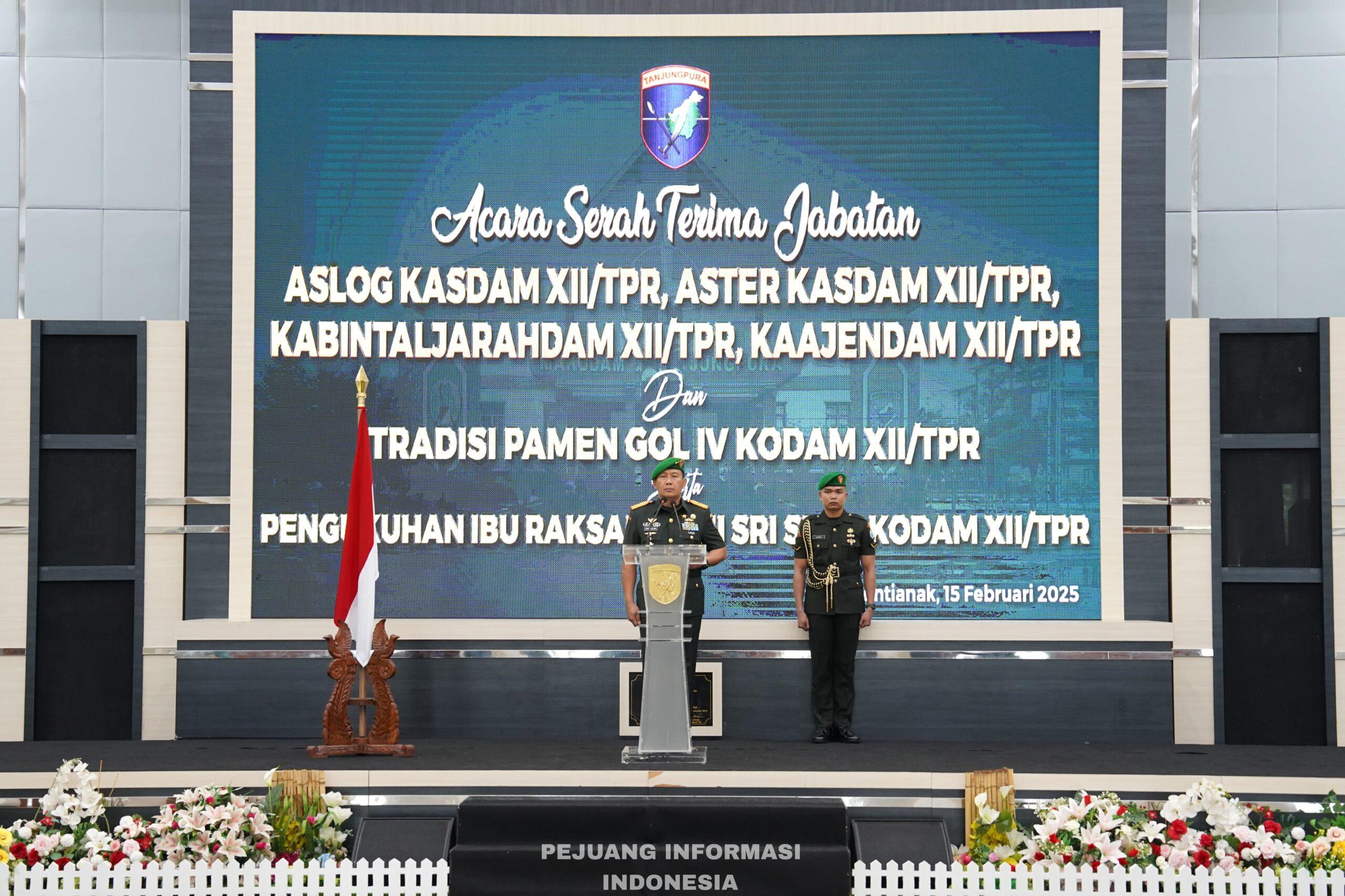 Pejabat yang melaksanakan Sertijab diantaranya, Aslog Kasdam XII/Tpr dari Kolonel Arh Mokhamad Ibnu Sukelan, S.I.P., kepada Kolonel Inf Muhammad Faizal Nasution, S.I.P. Aster Kasdam XII/Tpr dari Kolonel Arm Djoko Sujarwo kepada Kolonel Inf Denny Noviandi.