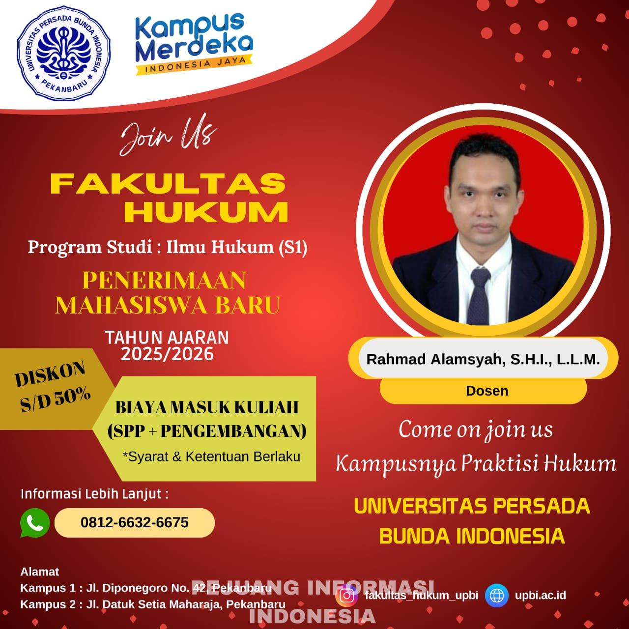 Pekanbaru, Riau — Kabar gembira datang dari dunia pendidikan tinggi di Riau! Dewan Redaksi PejuangInformasiIndonesia.com, Rahmad Alamsyah, S.H.I., L.L.M., yang juga dikenal sebagai dosen dan praktisi hukum di Universitas Persada Bunda Indonesia (UPBI), secara resmi mengumumkan penerimaan mahasiswa baru Tahun Ajaran 2025/2026 untuk Fakultas Hukum, Program Studi Ilmu Hukum (S1).