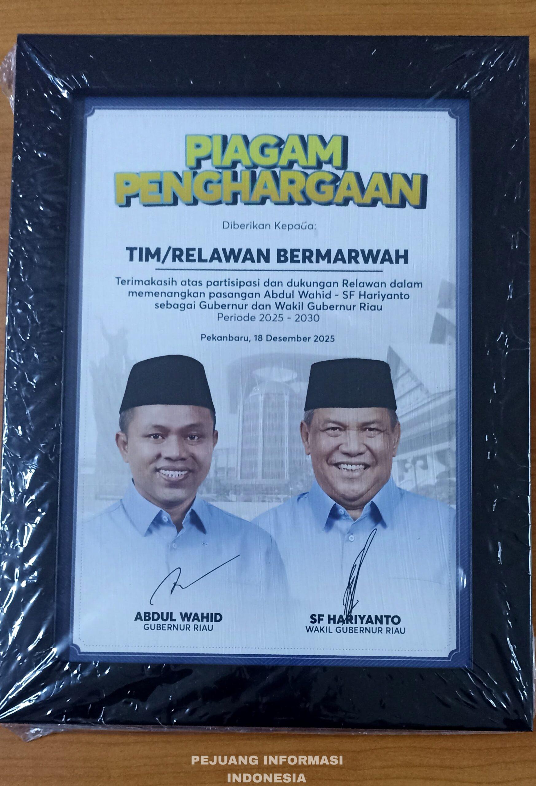 Pekanbaru, Riau – Dalam acara penuh haru dan kebanggaan, Gubernur Riau terpilih Abdul Wahid bersama Wakil Gubernur SF Hariyanto memberikan Piagam Penghargaan kepada Tim Relawan Bermarwah atas dedikasi, partisipasi, dan dukungan luar biasa mereka dalam memenangkan pasangan tersebut pada Pemilihan Gubernur Riau periode 2025-2030.