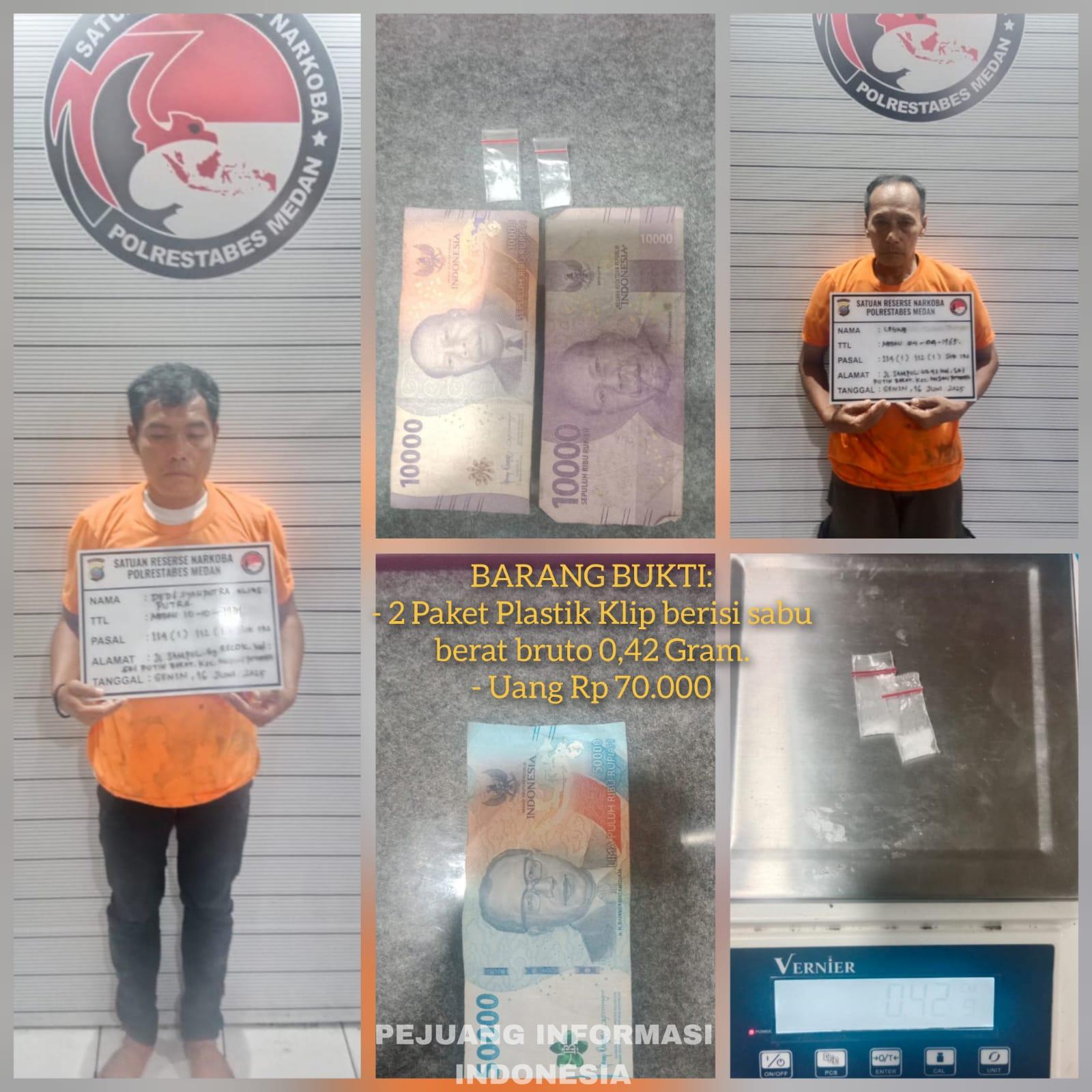 Kedua pemuda yang diamankan itu yakni, Fahmi Hariandi (32) warga Jalan Marelan, Gang Indah Medan dan Ggih anggah Pratama (34) warga Jalan Perwira, Kelurahan Tanjung Mulia, Medan Deli. “Polsi juga menyita barang bukti dari tersangka itu masing – masing yaitu, dua plastik klip berisikan kristal bening berat 2, 88 gram, satu dompet, satu buah sekop sabu dan satu timbangan elektrik, ” ucap Kapolrestabes Medan Kombes Pol Gidion Arif Setyawan melalui Kasat Narkoba AKBP Thommy Aruan kepada wartawan di Medan, Jumat (20/6/2025).