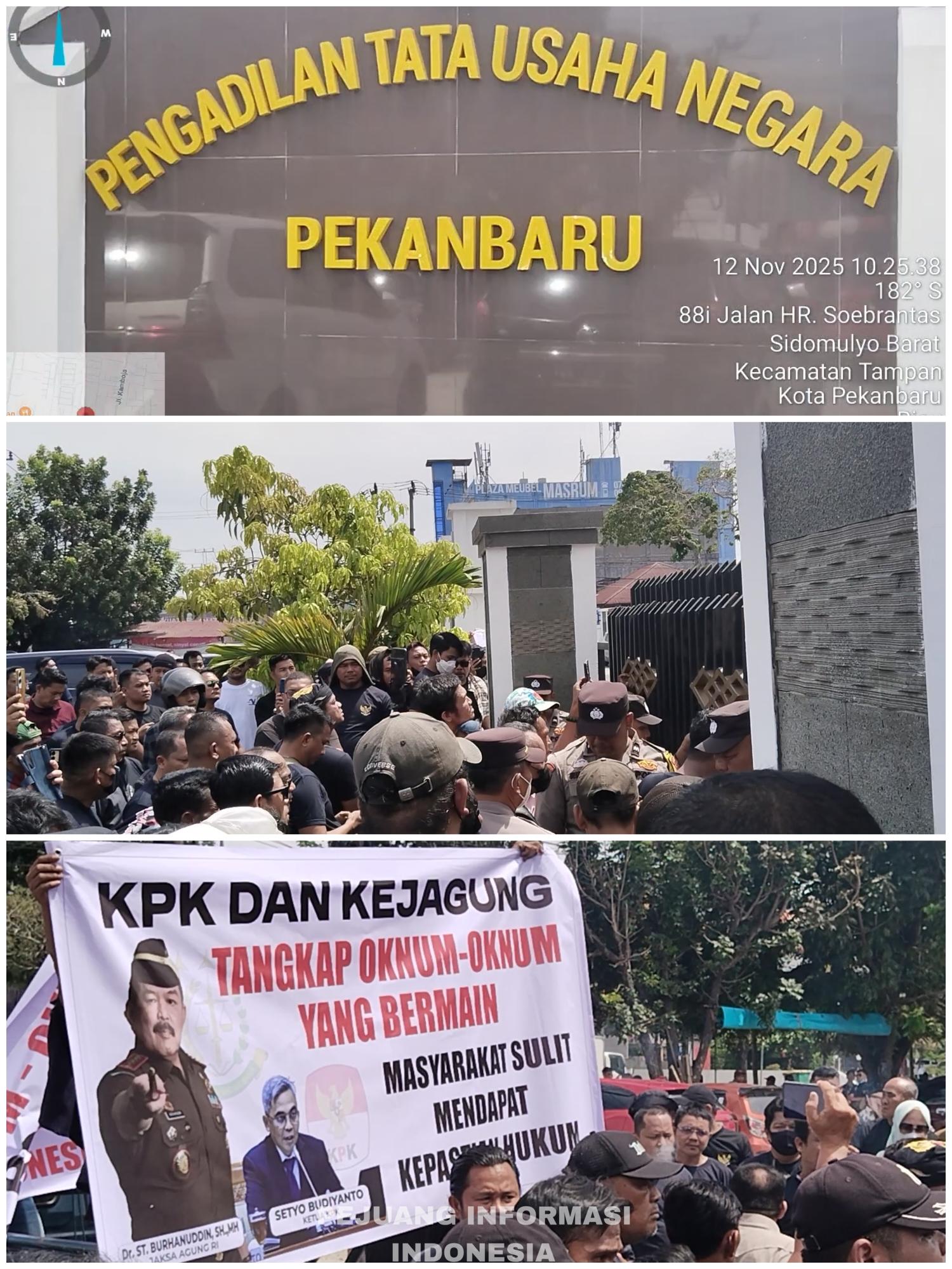Pekanbaru.Riau– Suasana di depan Pengadilan Tata Usaha Negara (PTUN) Pekanbaru, Rabu (12/11/2025), berubah tegang namun penuh semangat perjuangan. Ratusan masyarakat dari berbagai elemen berkumpul menggelar aksi damai menuntut keadilan dan menolak keras praktik mafia tanah serta dugaan permainan hukum yang kian merajalela di Riau.