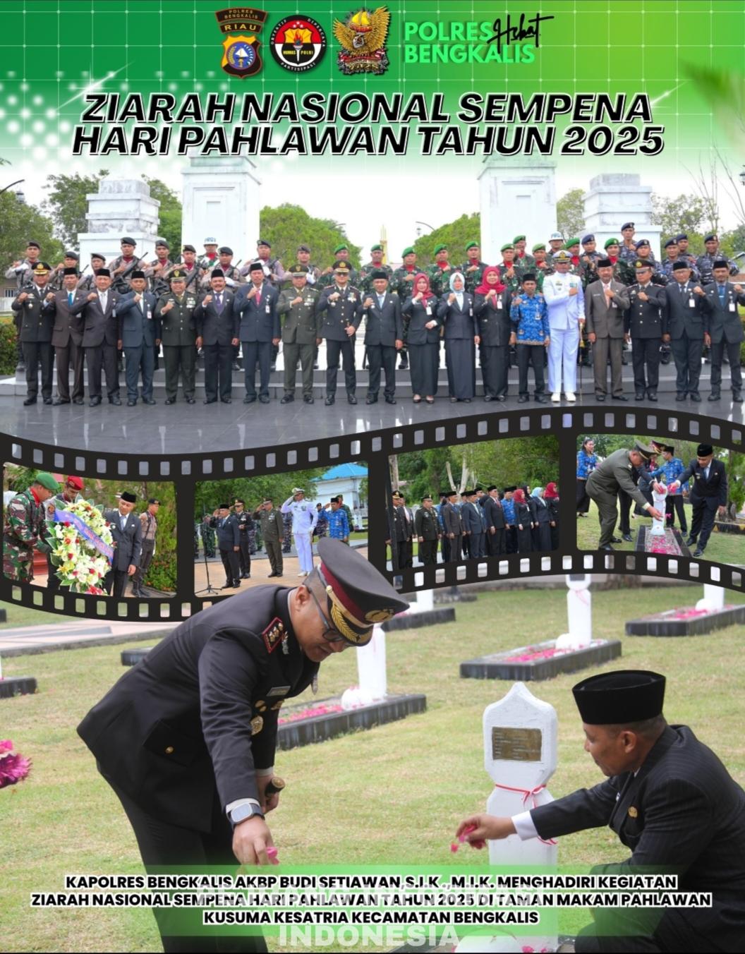 Dalam rangka memperingati Hari Pahlawan Nasional 10 November 2025, jajaran Forkopimda Kabupaten Bengkalis menggelar Ziarah Nasional di Taman Makam Pahlawan (TMP) Kusuma Kesatria, Kecamatan Bengkalis, Kabupaten Bengkalis, Provinsi Riau, Senin (10/11/2025).